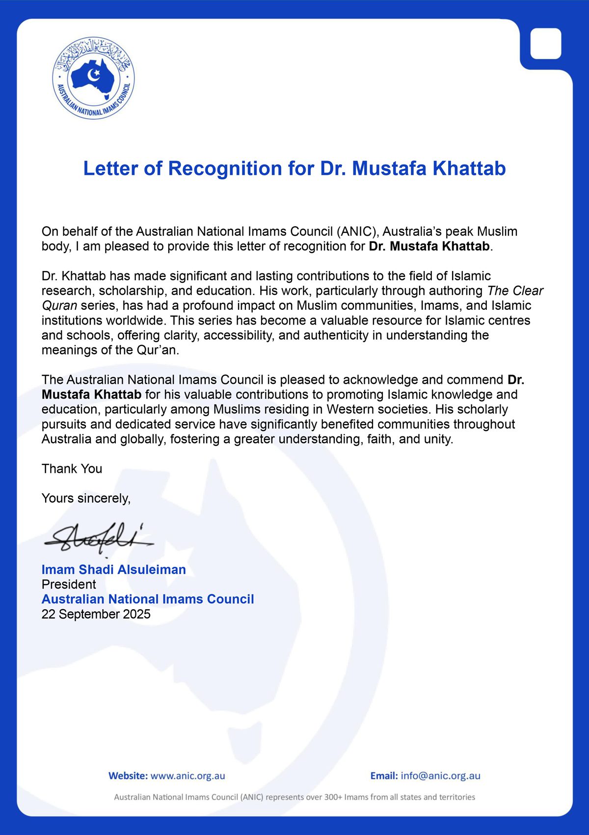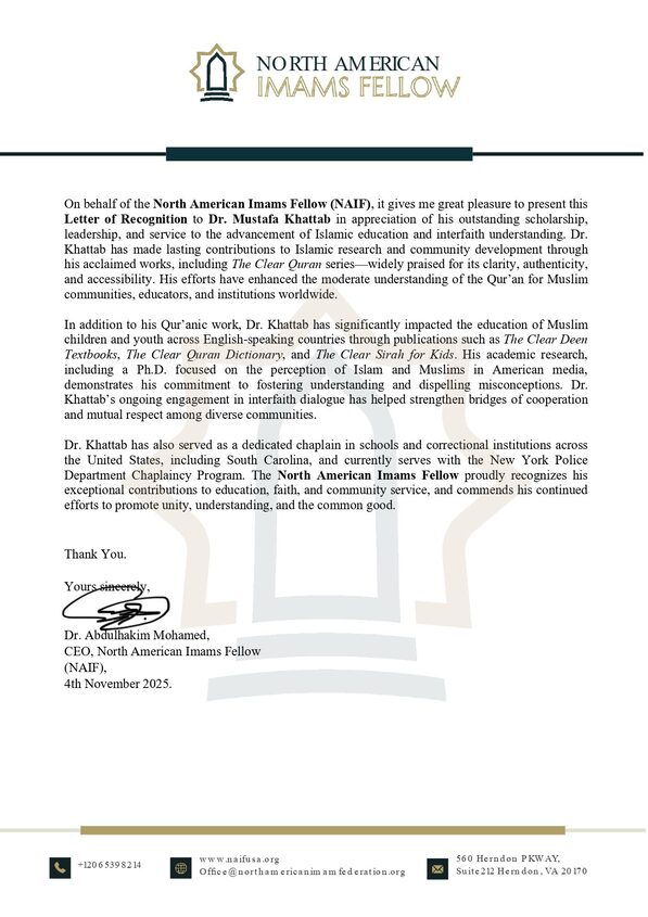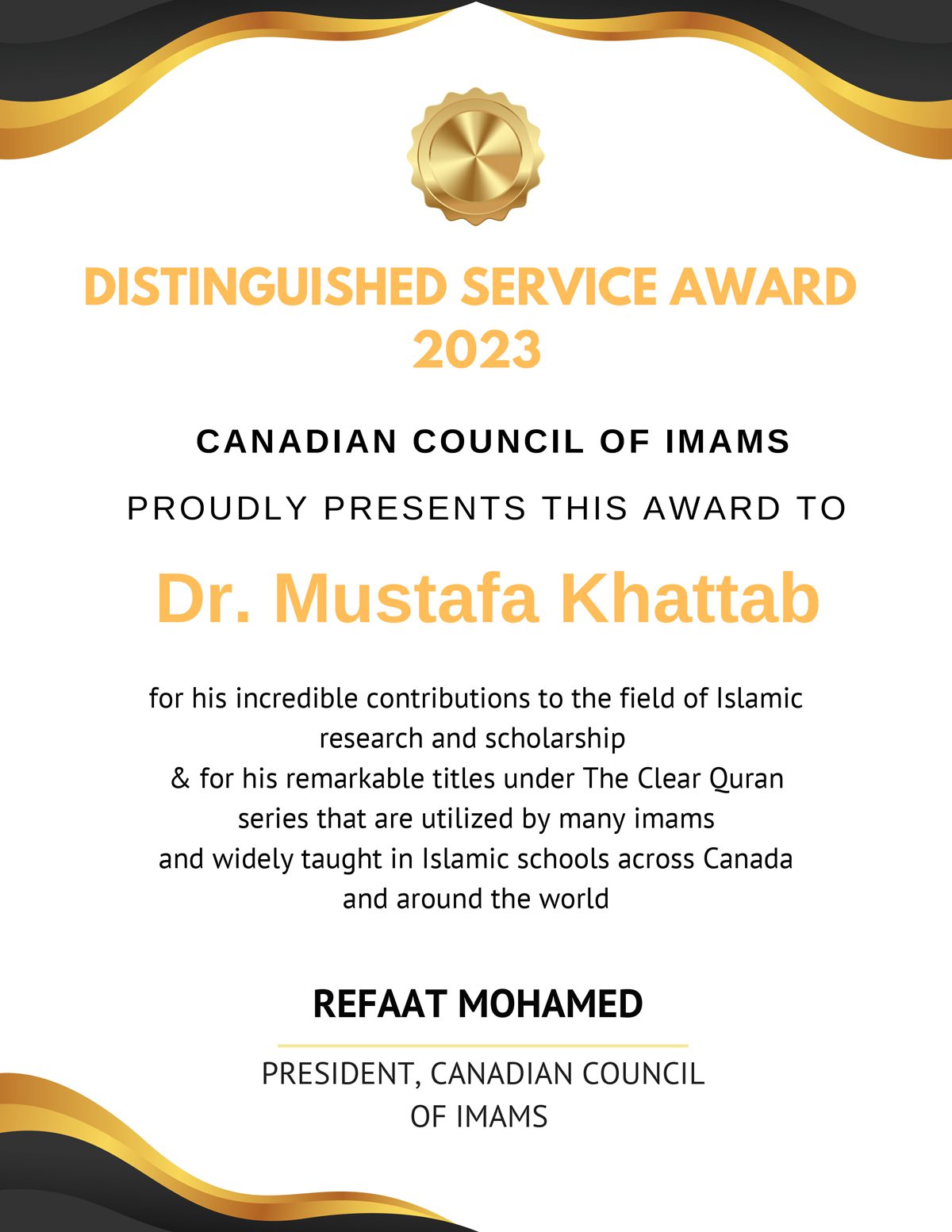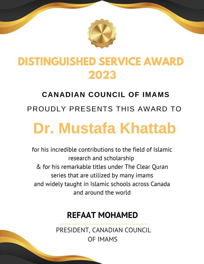 Dr. Mustafa Khattab is a Canadian-Egyptian authority on interpreting the Quran. He was a member of the first team that translated the Ramadan night prayers (Tarawîḥ) live from the Sacred Mosque in Mecca and the Prophet’s Mosque in Medina (2002-2005). Dr. Khattab memorized the entire Quran at a young age, and later obtained a professional ijâzah in the Ḥafṣ style of recitation with a chain of narrators going all the way to Prophet Muḥammad (S). He received his Ph.D., M.A., and B.A. in Islamic Studies in English with Honors from Al-Azhar University’s Faculty of Languages & Translation. He lectured on Islam at Clemson University (OLLI Program, 2009-2010), held the position of a lecturer at Al-Azhar University for over a decade starting in 2003, and served as the Muslim Chaplain at Brock University (2014-2016). He is a member of the Canadian Council of Imams and a Fulbright Interfaith Scholar. He has served as an Imam in the U.S.A. and Canada since 2007 and is the author of The Nation of Islam (2011) and Outfoxing Fox News (2017), and a contributor to the Encyclopedia of Muslim American History (2010). His forthcoming works include Qamus-ul-Quran (The Dictionary of Quranic Vocabulary).